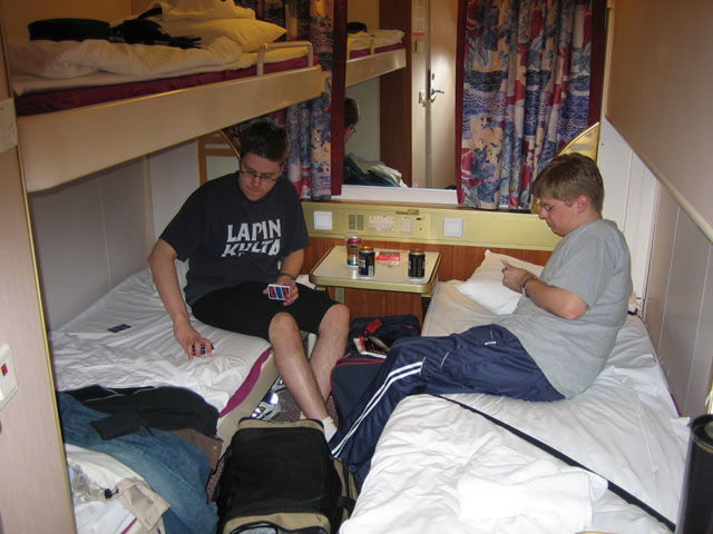 Hyttimme oli autokannen alla, kannella 2. Emme päässeet heti hytteihin siivoojien takia, niinpä käytimme odotusajan hyödyksi kiertelemällä laivaa ympäriinsä tutustuen siihen. Kun pääsimme hyttiimme, jätimme laukut sinne ja painuimme suoraan tax-free-ostoksille. Ostoksiin upposi (yllättäen) yli 100 euroa. Suihkuun ja sitten Matin kanssa oluelle ravintolaan. Kylmä olut maistui niin hyvälle pitkän ajomatkan jälkeen että oli pakko ottaa vielä toinen tuoppi. Hytissä pelattiin vielä korttia vähän aikaa ja joimme pois tarjousoluttölkit. Sitten nukkumaan ja valmistautumaan henkisesti ruotsiintumiseen. Laivamatkan hinnaksi tuli 136 euroa.