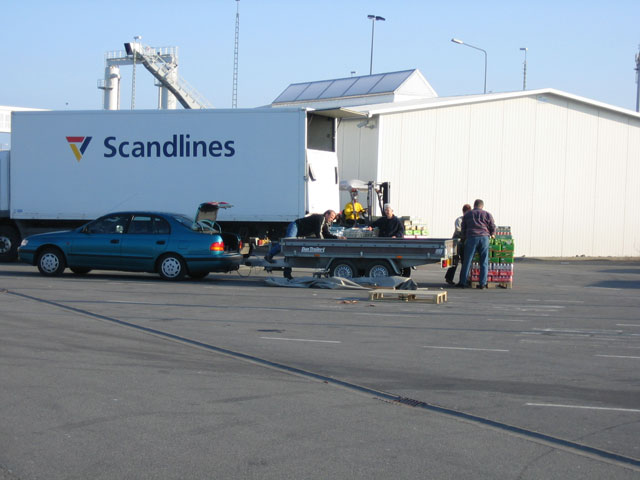 Puttgardenin satamassa parkkeerasimme heti Border-Shoppiin. Se oli vedessä kelluva tax-free-myymälä. Siellä vasta halpaa oli, ainakin olut. Lapparin 24-packi A:ta maksoi vain 9,39 euroa laatikko! Border-Shopissa pidimme noin tunnin mittasen paussin. Yllättäen mukaan tarttui muutama keissi.