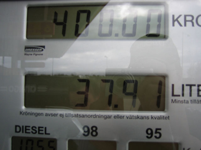 Vähän ennen Malmöä pysähdyimme tankkaamaan auton ja tyhjentämään omat "tankit". Diesel oli kyllä koko reissun kalleinta, euroiksi muutettuna niinkin paljon kuin 1,17 litralta!