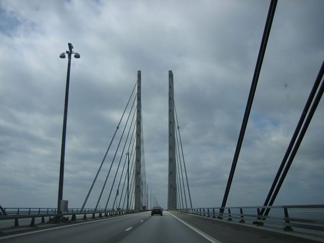 Kävimme myös Lidlissä täydentämässä ruokavarastoja. Matkan aikana oli kova vastatuuli, suksiboksi katolla vastustaa aikalailla matkantekoa. Siitä kielii melkoisen suuri kulutus, 9,32 litraa sadalle kilometrille! Näillä dieselin hinnoilla meinasi itku päästä... Malmö-Kööpenhamina-sillalle löytäminen osoittautui hankalammaksi tehtäväksi mitä luulimme. Käännyimme vikasuuntaan parissa risteyksessä. No, se hyväpuoli siitä oli, että tulipa nähtyä Malmönkin keskusta... Sitten Juutinrauman siltaa kohti. Sillalle oli helppo ajaa, luottokortti koneeseen ja portti aukeaa. Itse silta oli melkoinen kokemus. On rahaa palanut tähänkin hankkeeseen... Näköalat olivat ainakin mahtavat. Sillalla oli kaksi kaistaa molempiin suuntiin vievä moottoritie, rajoitus 110 km/h.