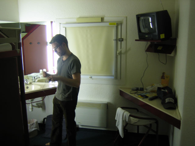 Otettiin kuvia jalustan kanssa. Alkoi olla kylmä ja meninkin autoon hieman lämmittelemään. Pojat tulivat kameroineen hetken päästä perässä. Siitä sitten Calaisia kohti. Jonkin matkan päässä tuli liikenneympyrä, josta Antti bongasi Formula 1 -hotellin merkin. Se piti vielä palata tarkistamaan, koska hotelllia ei oltu merkitty karttoihimme. No, olihan siinä hotellin mainos, päätimme siis jäädä siihen yöksi, koska alkuperäiseen paikkaamme oli vielä varman 50 kilometriä matkaa. Kellokin alkoi lähestyä jo kymmentä. Paikan nimi oli Cequelles. Saavuimme hotellille ja päätimme, että klo 10.00 olisimme valmiita lähtöön. Suunnitelmissa oli palata hieman takaisinpäin katsomaan edellä mainitut näköalapaikat päivänvalossa. Kävimme suihkussa ja otimme yhdet oluet että tulisi uni paremmin silmään. Kirjottelin vielä hieman päiväkirjaa. Sitten nukkumaan. Päätän tältä iltaa tähän. Cequelles klo 00.09 CET. |