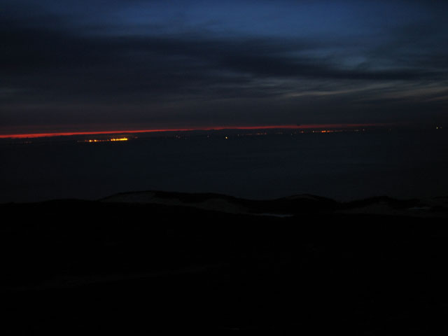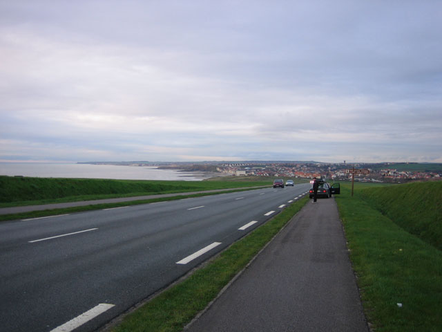 Minä jatkoin sitten ajamista kohti yöpaikkaa. Calaisiin ei olisi enää pitkä matka, ja suunnittelemamme yöpaikka olisi siitä vielä vähän matkan päässä. Muutama kilometri ajettuamme tie alkoi kohoamaan korkealle mäelle. Näköalat vain paranivat paranemistaan, pojat käskivät kääntää sivutielle, joka vei ihan sen mäen huipulle. Huipulla oli mahdottoman korkea kivipaasi/patsas tai jokin sen tapainen. Epäiltiin, että paikka olisi Normandian maihinnousun juhlapaikka. Ilta alkoi hämärtyä (tai oikeastaan alkoi olla jo melko pimeää), joten muuta näköalaa ei huipulta näkynyt kuin kaupunkien valot. Näky oli kuitenkin vaikuttava. Alettiin olla kohdassa, jossa Englannin kanaali on kapeimmillaan. Englannin puolen valot näkyivät jo hienosti.