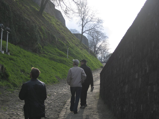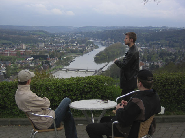 Sieltä sitten laskeuduttiin alas kohti hämärtyvää Namurin keskustaa ja autoamme. Kivi-paperi-sakset-menetelmällä arvottiin väliltä hotelli-keskusta. Hotelli voitti, sinne sitten takaisin. Pikaiset suihkuuntumiset taas, avattiin vielä pullo Ranskasta Super-U -marketista ostettua punaviiniä, jonka nautimme fiinisti oikein muovimukeista. Punaviini huuhdeltiin alas vielä pullollisilla olutta. Pelasimme paskahousua erän ja sitten nukkumaan.